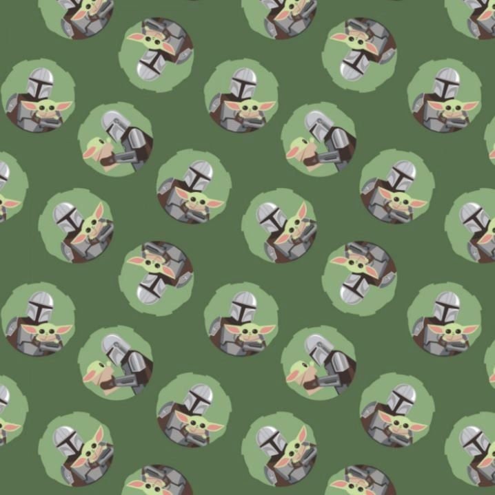 Star Wars Green Mandalorian & Baby Yoda Toss 100% Cotton Fabric Fat Quarter-18"x22" Half Yard-18"x44" 1 Yard-36"x44" Content: 100% Cotton Vendor: Camelot Care: Machine wash gentle cold, non-chlorine bleach, tumble dry low, warm iron. Condition: New