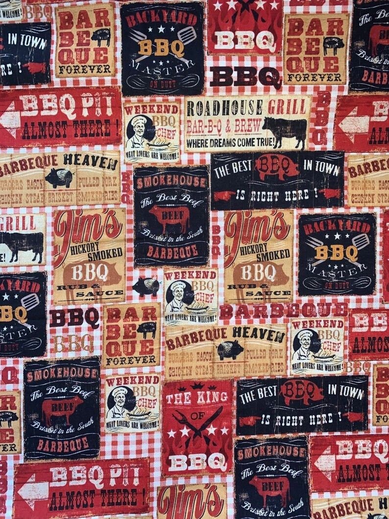 Barbecue Patch Fabric 100% Cotton Fabric Fat Quarter-18"x22" Half Yard-18"x44" 1 Yard-36"x44" Text Includes: King Of BBQ Backyard BBQ Master On Duty The Best BBQ In Town Is Right Here! BBQ Forever Roadhouse Grill Bar-B-Q & Brew Where Dreams Come True! Condition: New Care: Machine Wash, Cold, Delicate Cycle; Tumble Dry, Low; Use Warm Iron; Non-Chlorine Bleach Only. Content: 100% Cotton