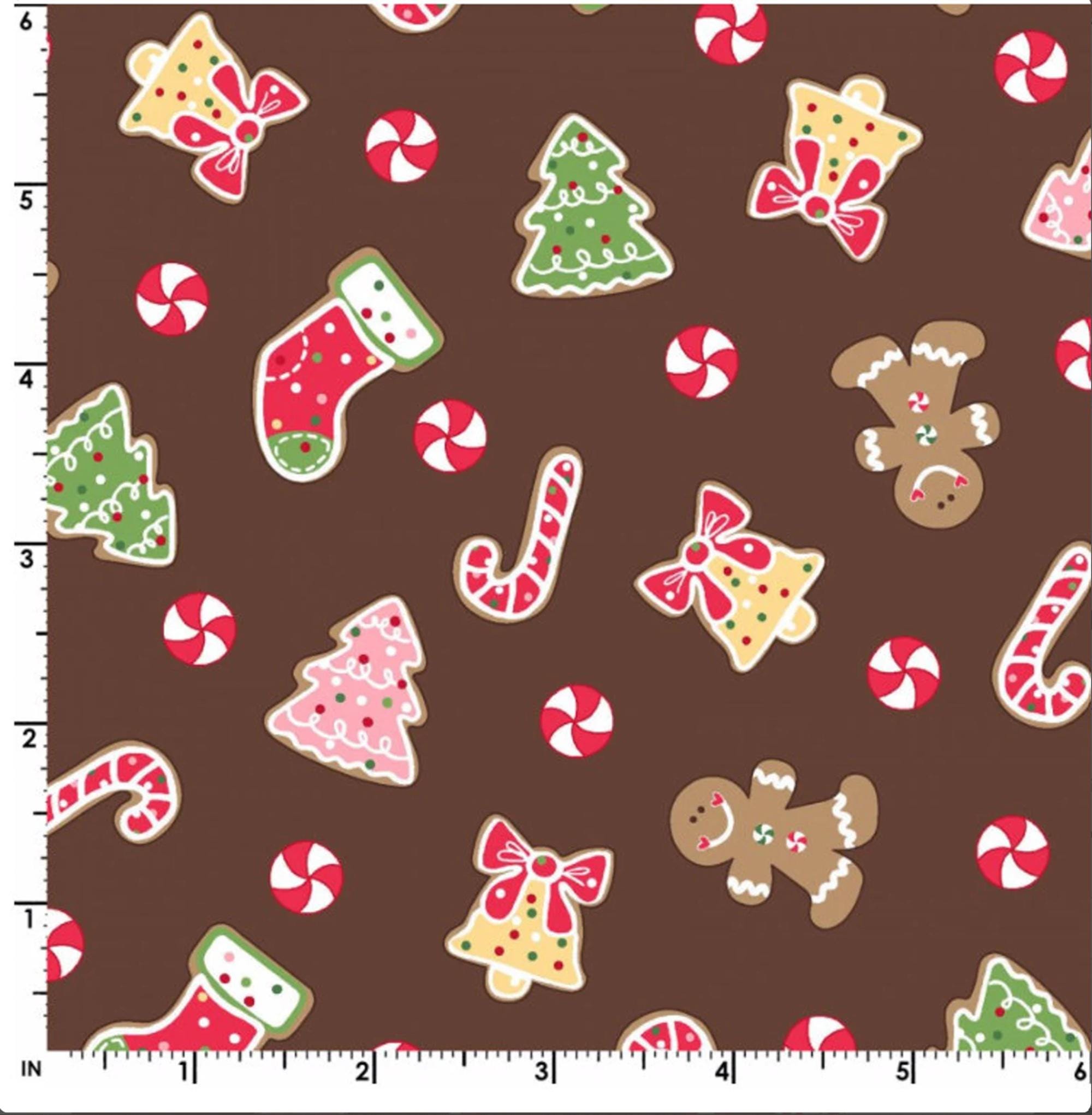 Kimberbell Jingle & Whisk - Brown Christmas Cookies Cotton Fabric Fat Quarter -18"x22" Half Yard- 18" x 44" 1 Yard - 36" x 44"; Sold by the yard and cut in one continuous piece. Kimberbell, Maywood Studio, Novelty Fabric Content:100% Cotton Condition: New