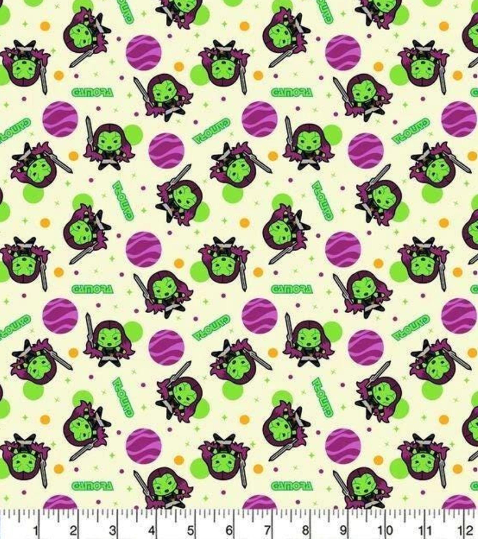 Marvel Guardians of the Galaxy Gamora Cotton Fabric-100% Cotton Fat Quarter-18"x22" Half Yard-18"x44" 1 Yard -36" x 44" ;Sold by the yard; continuous cut Content: 100% Cotton Vendor: Camelot Care: Machine wash gentle cold, non-chlorine bleach, tumble dry low, warm iron