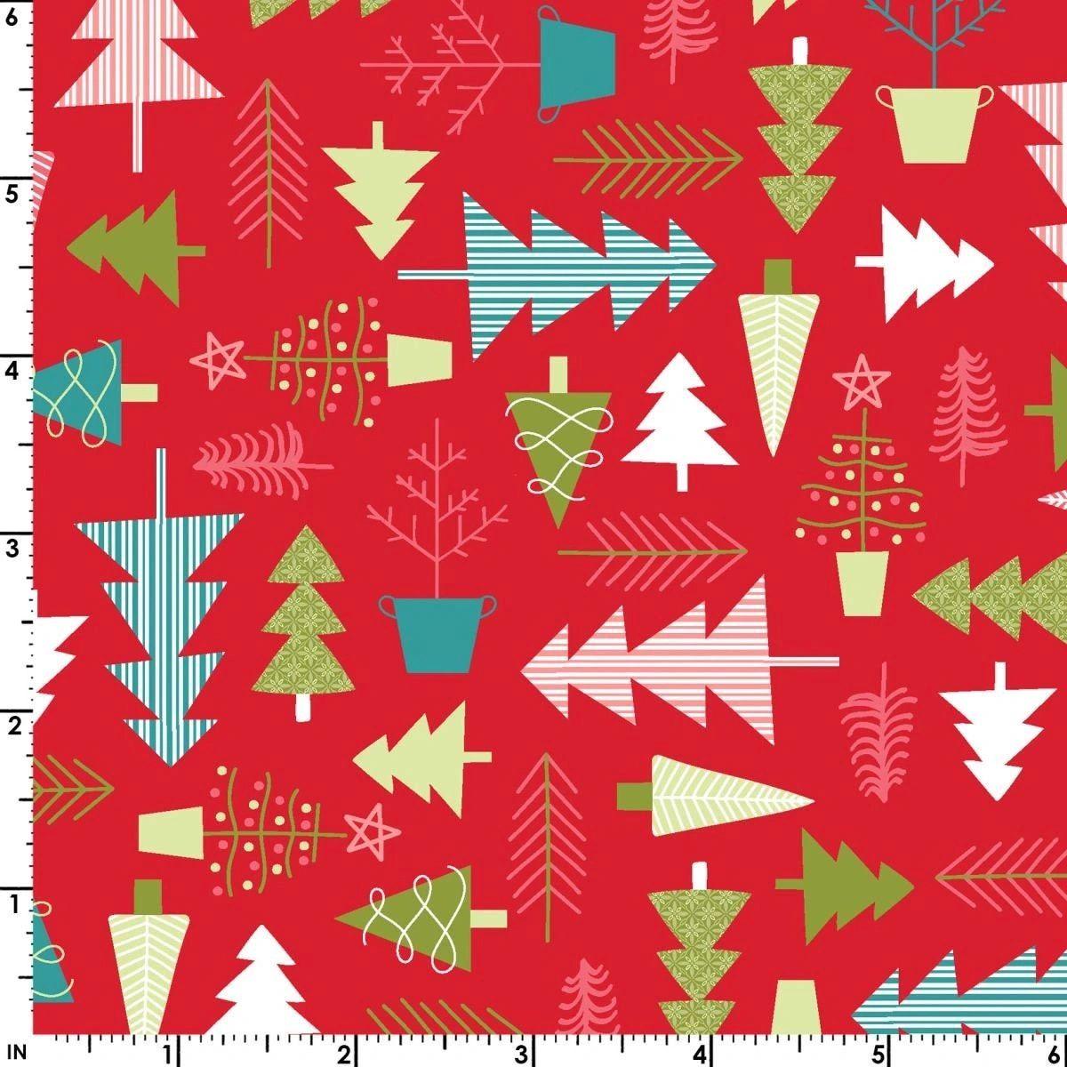 Kimberbell Cup of Cheer Christmas Tree Farm Red Cotton Fabric Fat Quarter -18"x22" Half Yard- 18" x 44" 1 Yard - 36" x 44"; Sold by the yard and cut in one continuous piece. Kimberbell, Maywood Studio, Novelty Fabric Content:100% Cotton Condition: New