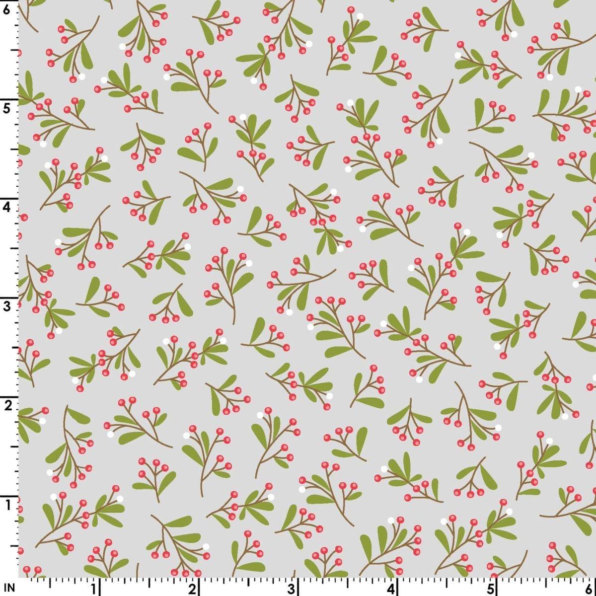 Kimberbell Cup of Cheer Mistletoe Grey Cotton Fabric Fat Quarter -18"x22" Half Yard- 18" x 44" 1 Yard - 36" x 44"; Sold by the yard and cut in one continuous piece. Kimberbell, Maywood Studio, Novelty Fabric Content:100% Cotton Condition: New
