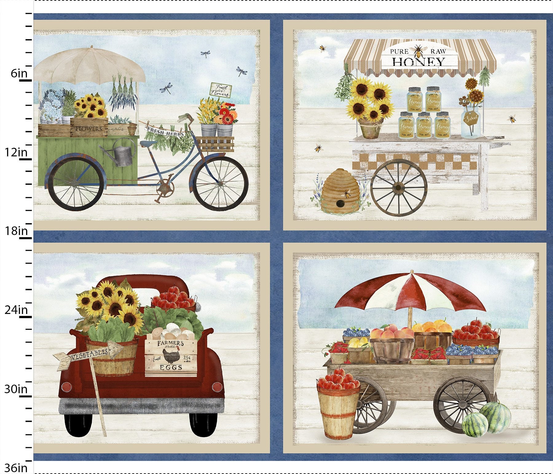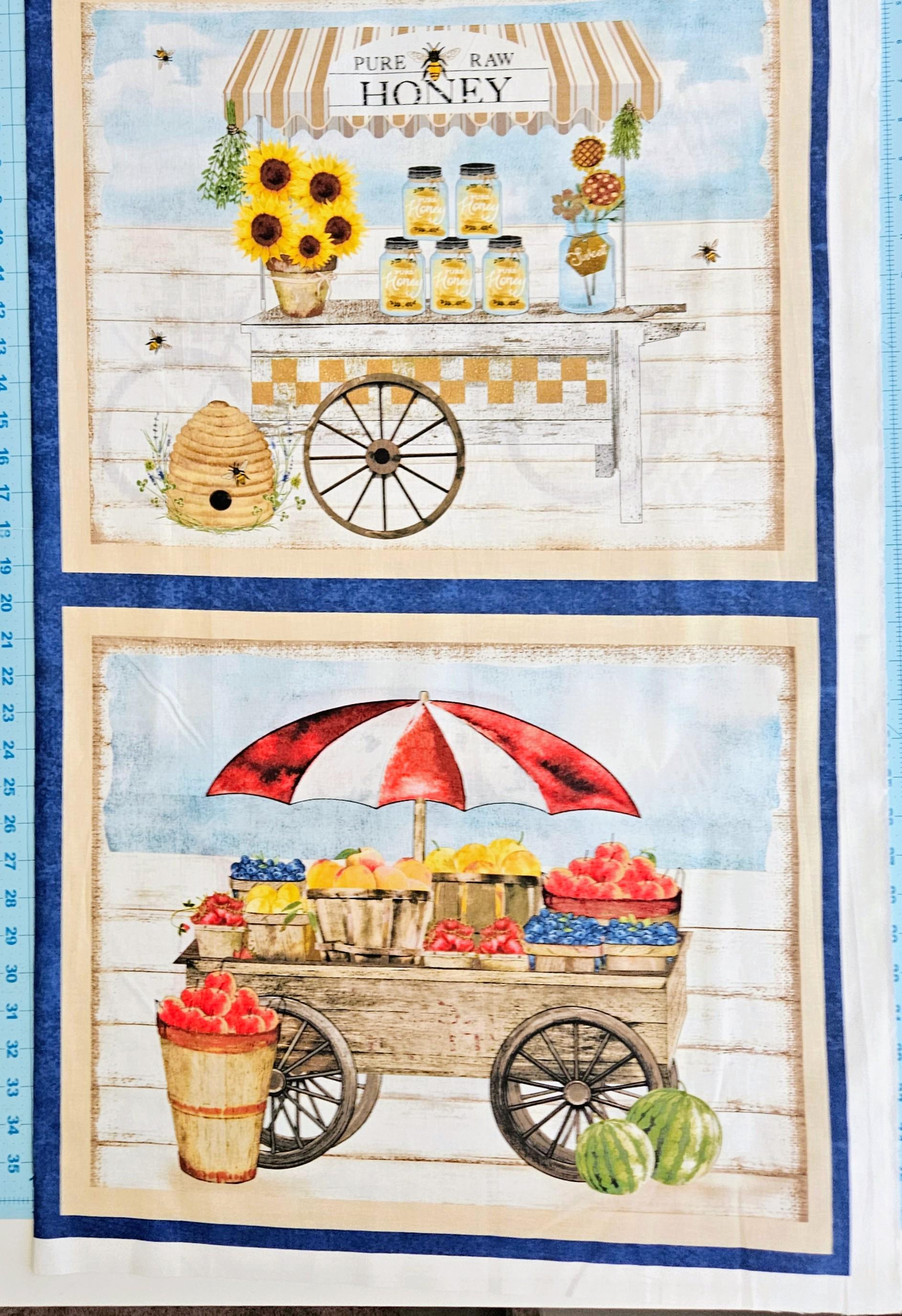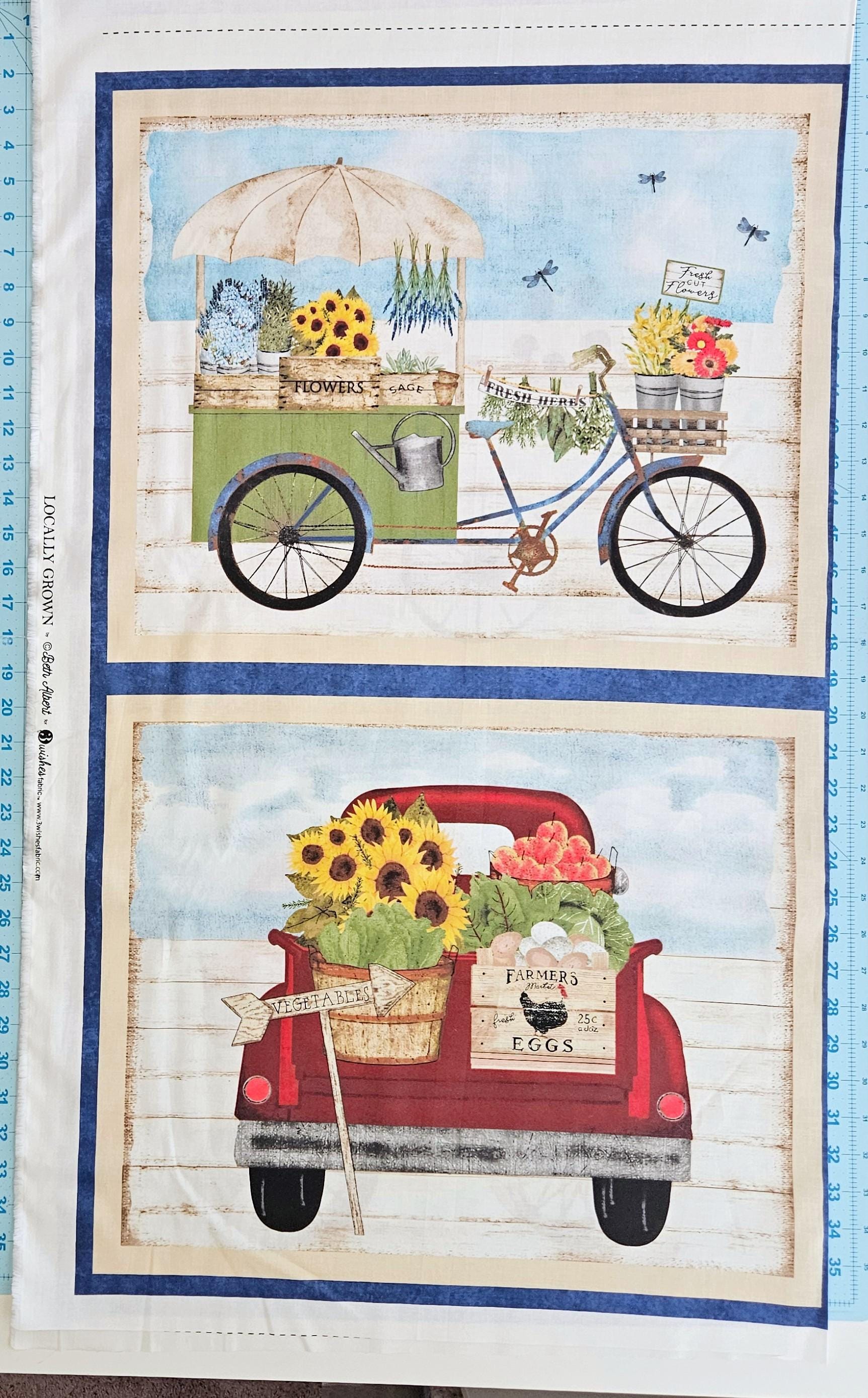 Celebrate farm-fresh charm with this 3 Wishes Locally Grown Local Produce Panel 100% Premium Cotton Fabric by Beth Albert. Featuring rustic farm signage and produce-themed artwork, this vibrant fabric panel is perfect for wall hangings, quilts, kitchen décor, and unique sewing projects.