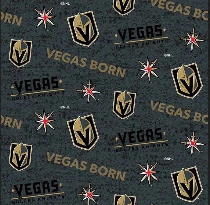 Show your team spirit with this NHL Las Vegas Golden Knights Vegas Born 100% Cotton Fabric by Sykel Fabrics. Featuring the Golden Knights logos and team graphics, this officially licensed NHL fabric is perfect for quilts, game-day décor, stadium blankets, apparel accents, and fan crafts. This Vegas Golden Knights fabric is a great choice for quilting blocks, pillows, tote bags, wall hangings, and handmade gifts. Whether you're cheering at the arena or from home, this fabric is a must-have for fans. Available Cuts (Precut): Fat Quarter: 18" x 21" - precut Half Yard: 18" x 42" - precut 1 Yard: 36" x 42" (Sold in one continuous cut when ordering multiple yards) Details: Copyright: "NHL" Licensed: "NHL" Vendor: Sykel Enterprises Care: Machine wash gentle cold, non-chlorine bleach, tumble dry low, warm iron.