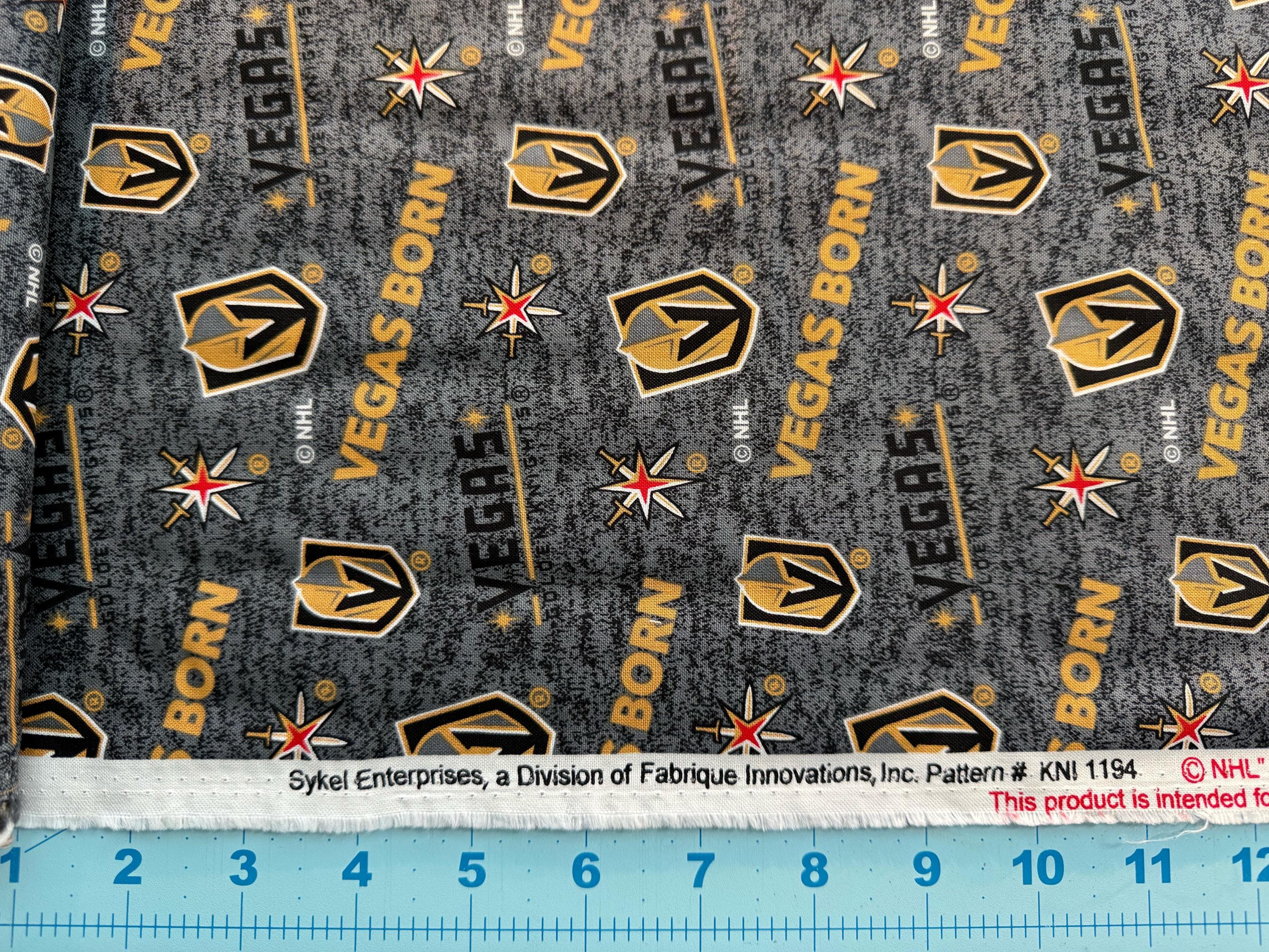 Show your team spirit with this NHL Las Vegas Golden Knights Vegas Born 100% Cotton Fabric by Sykel Fabrics. Featuring the Golden Knights logos and team graphics, this officially licensed NHL fabric is perfect for quilts, game-day décor, stadium blankets, apparel accents, and fan crafts. This Vegas Golden Knights fabric is a great choice for quilting blocks, pillows, tote bags, wall hangings, and handmade gifts. Whether you're cheering at the arena or from home, this fabric is a must-have for fans.