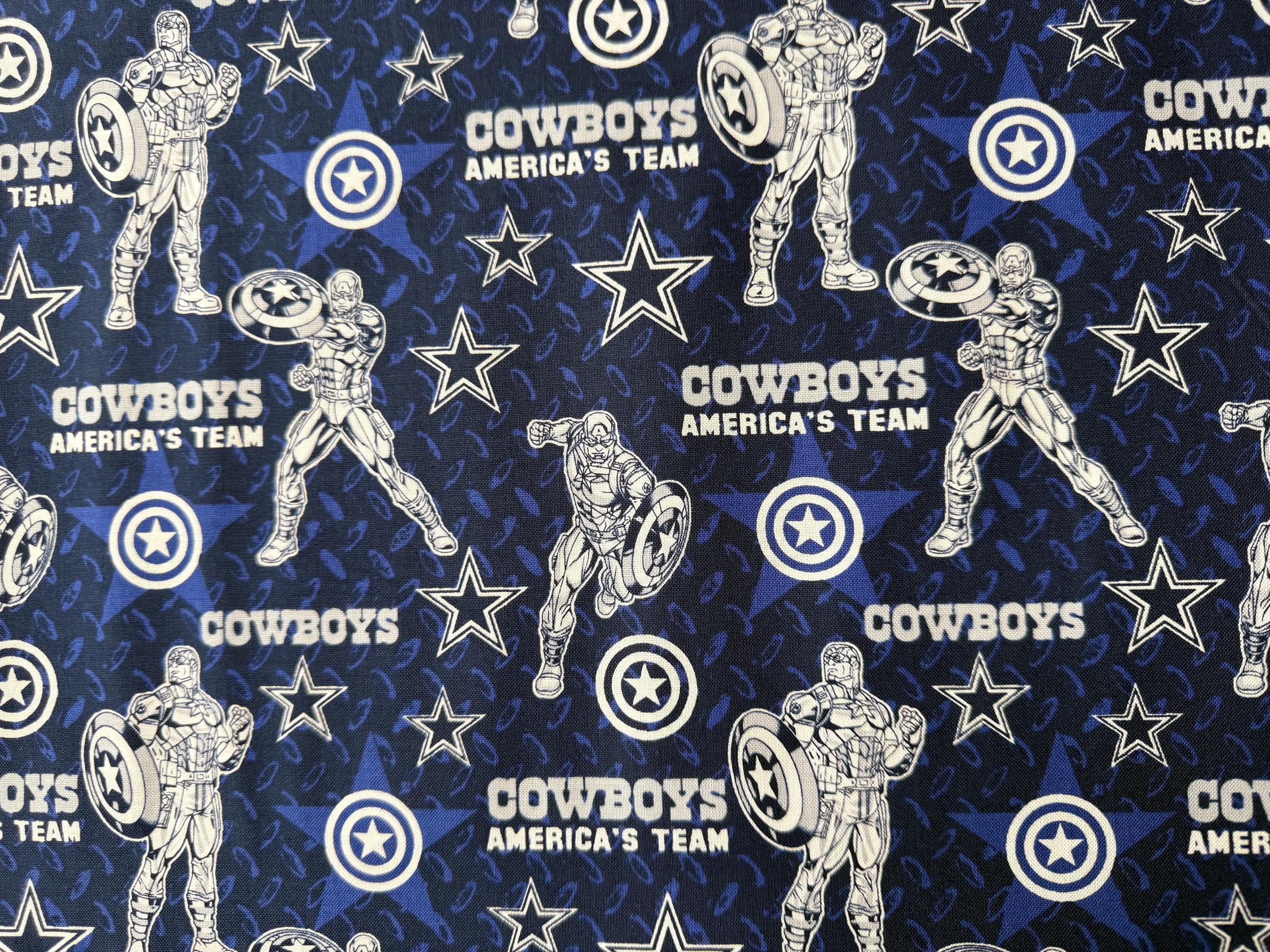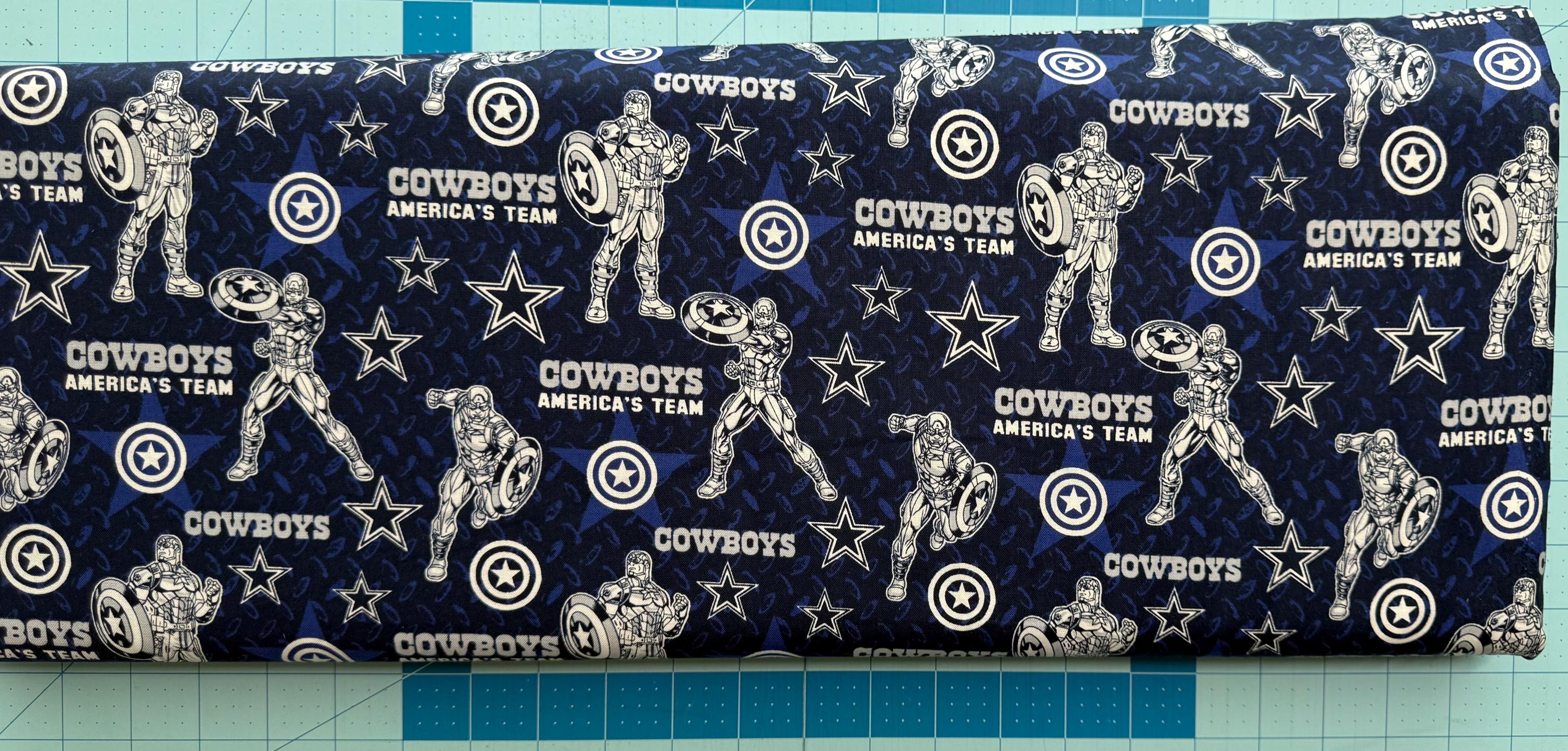 This Marvel and Cowboys fabric is a unique design for tote bags, stadium blankets, wall hangings, pillows, table runners, or one-of-a-kind gifts. Great for football fans and Marvel enthusiasts alike.