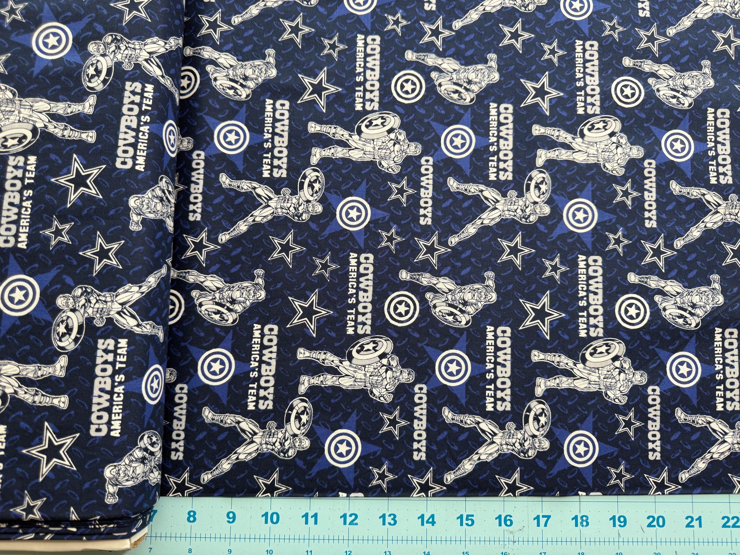 Show your team and superhero spirit with this NFL Marvel Captain America/Cowboys Mashup 100% Cotton Fabric by Fabric Traditions. Featuring Captain America alongside the Dallas Cowboys logos, this officially licensed crossover fabric is perfect for quilting, apparel accents, sports crafts, décor, and handmade fan projects.