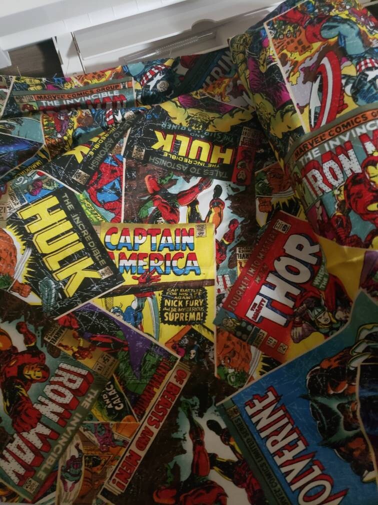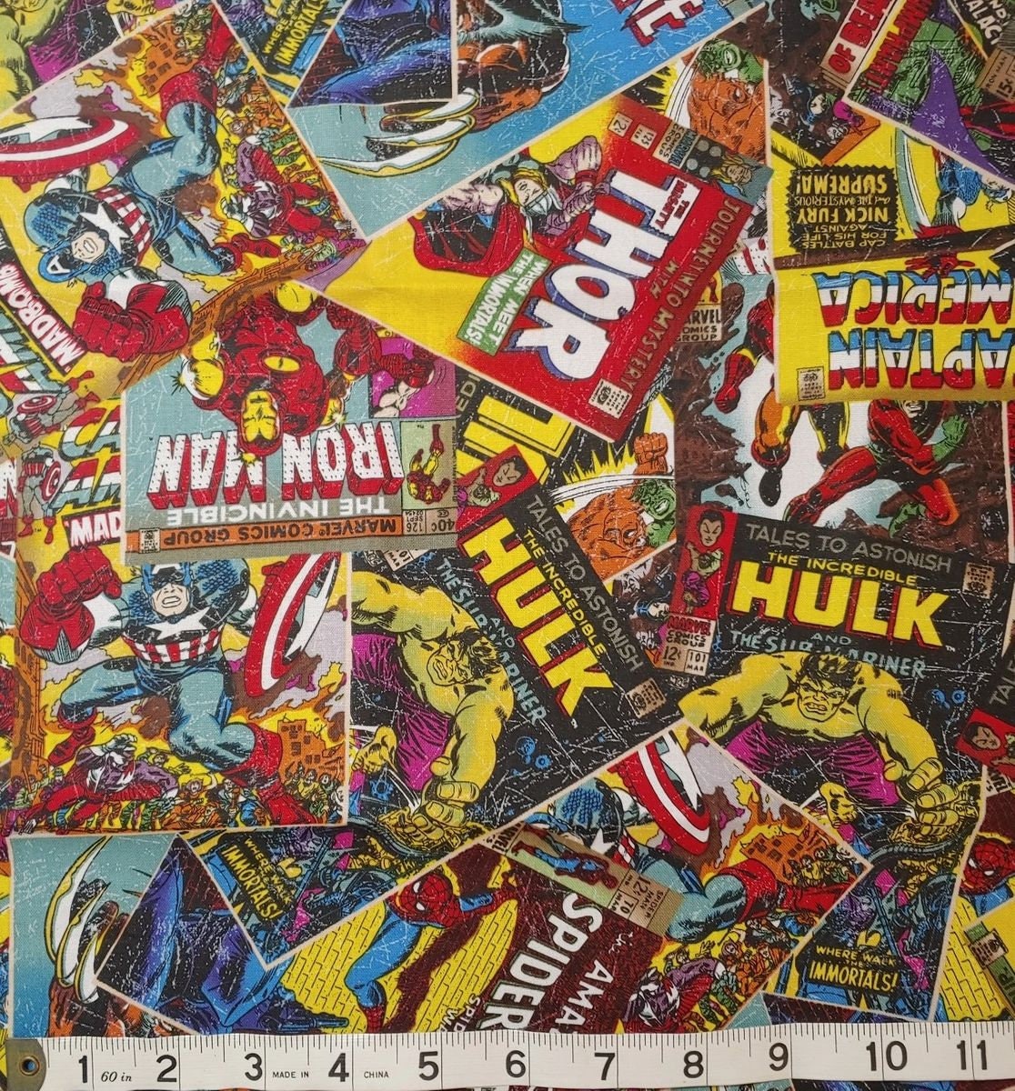 Marvel Comics Retro FabricFat Quarter - 18"x22"Half Yard-18"x44"1 Yard-36"x44"Thor, Hulk, Captain America, Iron Man, Spider-ManContent: 100% CottonVendor: CamelotCare: Machine wash gentle cold, non-chlorine bleach, tumble dry low, warm ironCondition: newCategory: Craft Supplies & Tools > Fabric & Notions > Fabriccondition: newmsrp: 0.0category: Craft Supplies & Tools > Fabric & Notions > Fabric