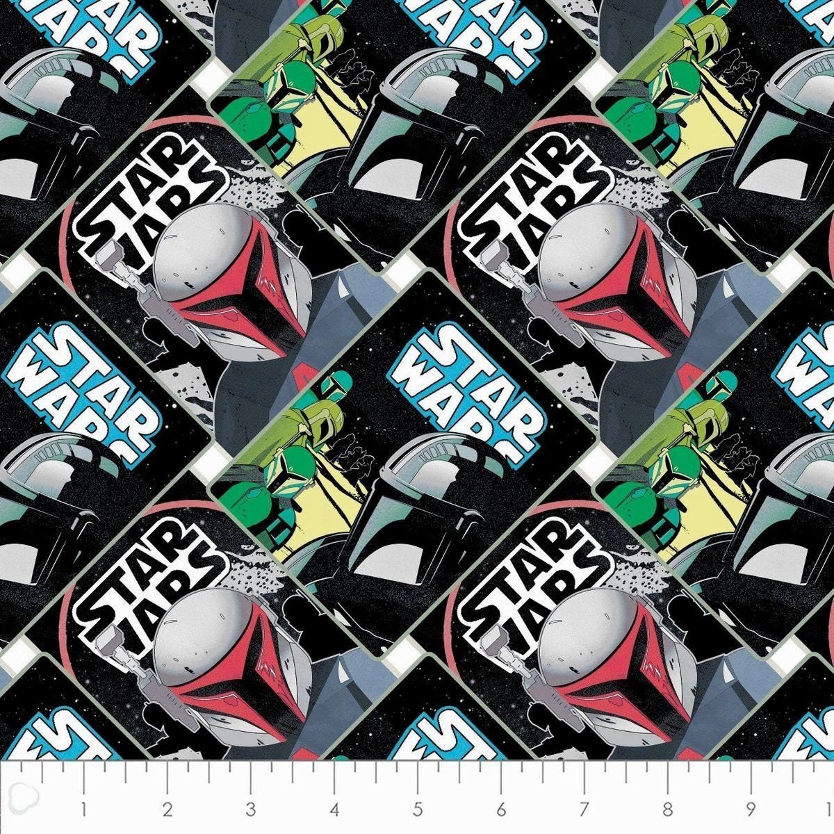 Star Wars Mandalorian Poster Collage Fabric Fat Quarters are 18" x 22" Half yards are 18" x 44" 1 yard cuts are 36" x 44"; continuous cut when you order multiple quantities. Content: 100% Cotton Vendor: Camelot Care: Machine wash gentle cold, non-chlorine bleach, tumble dry low, warm iron