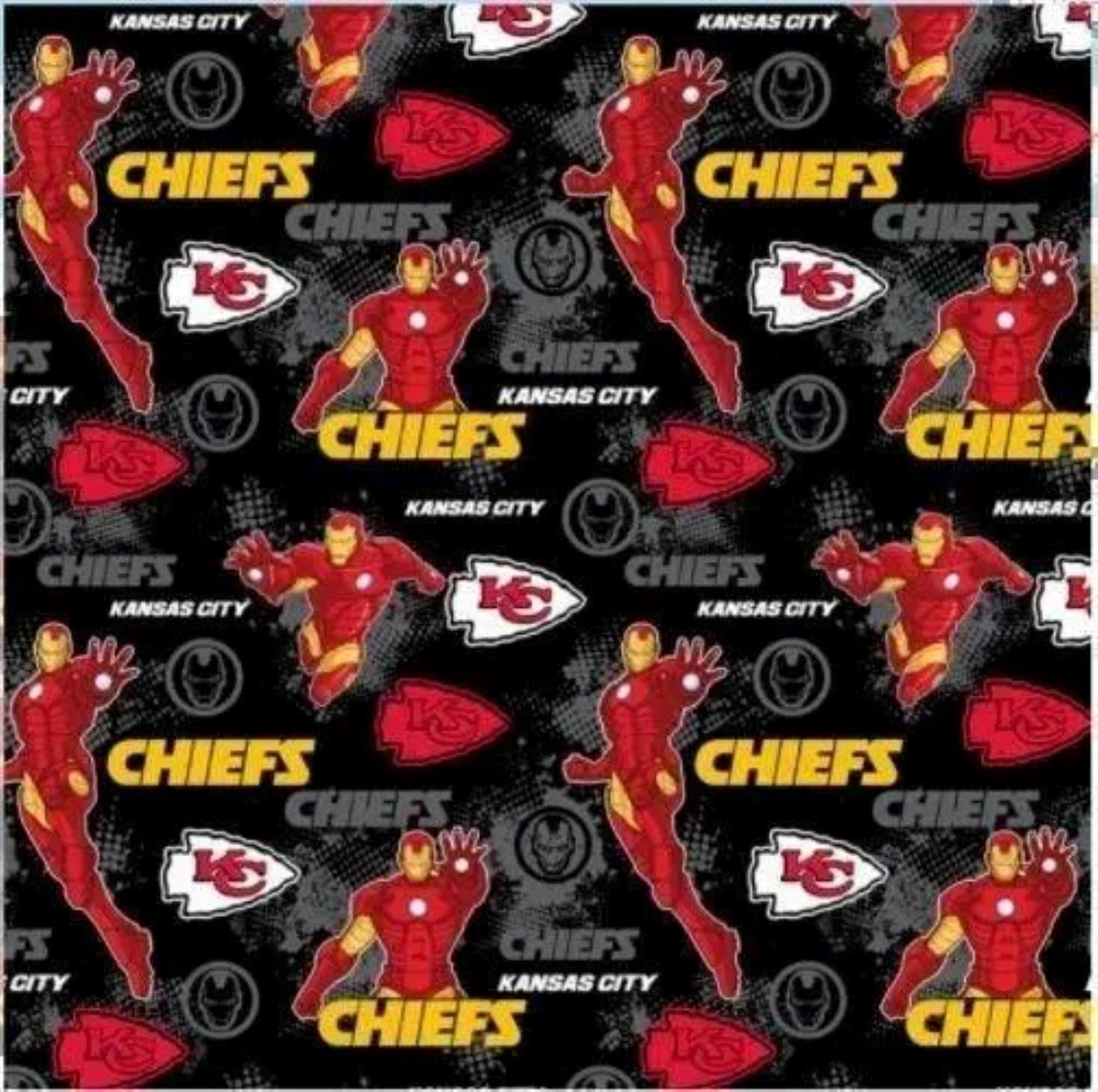Show your love for superheroes and football with this NFL Marvel Iron Man / Kansas City Chiefs 100% Cotton Fabric by Fabric Traditions. Featuring Iron Man alongside the Kansas City Chiefs logos and colors, this officially licensed fabric is perfect for quilts, décor, apparel accents, fan gear, and novelty crafts.