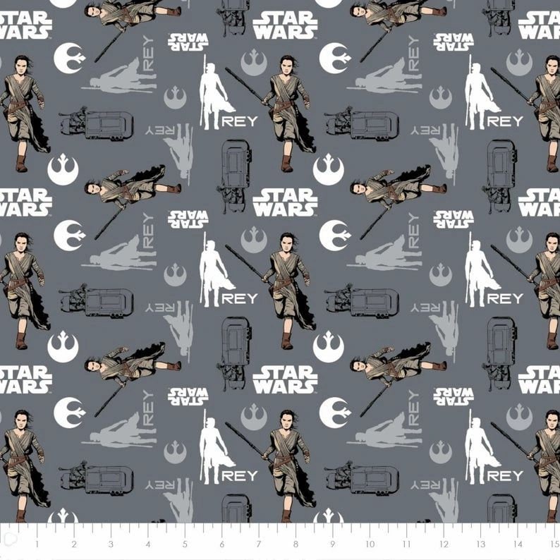 Bring the galaxy to your projects with this Star Wars The Force Awakens Rey Grey 100% Cotton Fabric. Featuring Rey in a bold design from The Force Awakens, this officially licensed Star Wars fabric is perfect for quilting, apparel, décor, and creative crafts.