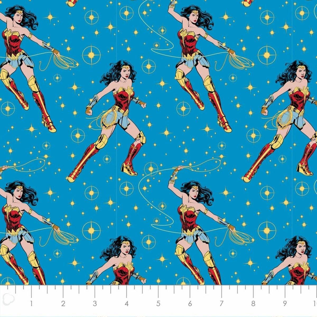 Add superhero flair to your sewing with this Blue Wonder Woman Lasso 100% Cotton Fabric by Camelot. Featuring Wonder Woman with her iconic golden lasso on a bold blue background, this officially licensed DC Comics fabric is perfect for quilts, apparel accents, crafts, and décor.