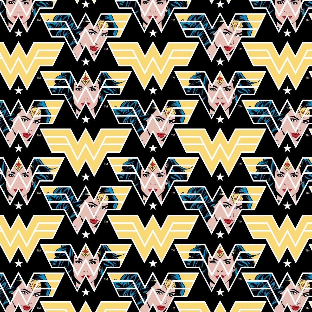 Show off superhero strength with this Black Wonder Woman Logo Faces 100% Cotton Fabric by Camelot. Featuring Wonder Woman faces and logos on a bold black background, this officially licensed DC Comics fabric is perfect for quilting, apparel accents, bags, home décor, and superhero crafts.