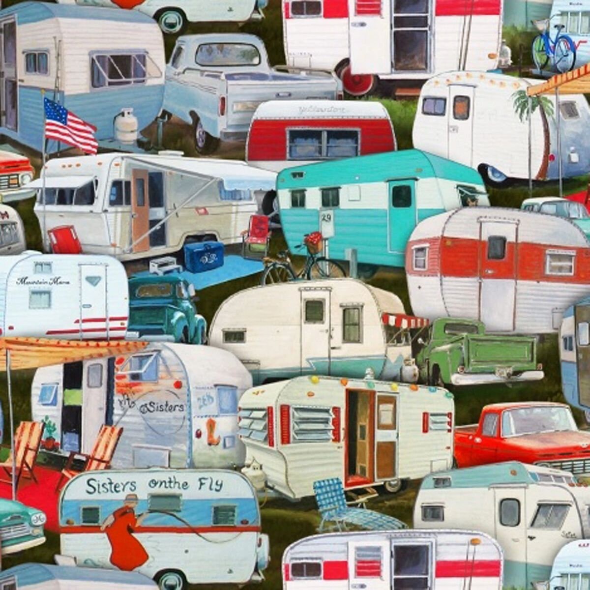 Vintage Trailer - Multi 100% Cotton FabricFat Quarter- 18"x21"Half Yard-18"x43"1 Yard-36"x43"Designer: Paige Bridges Vendor: Elizabeth StudiosCare: Machine wash warm, tumble dry low. Cool iron, if necessary.